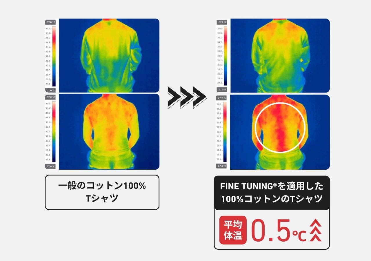 FT™︎適用したTシャツを身につけて20分後の体温変化を測定したところ、平均体温が0.5℃上昇しました。