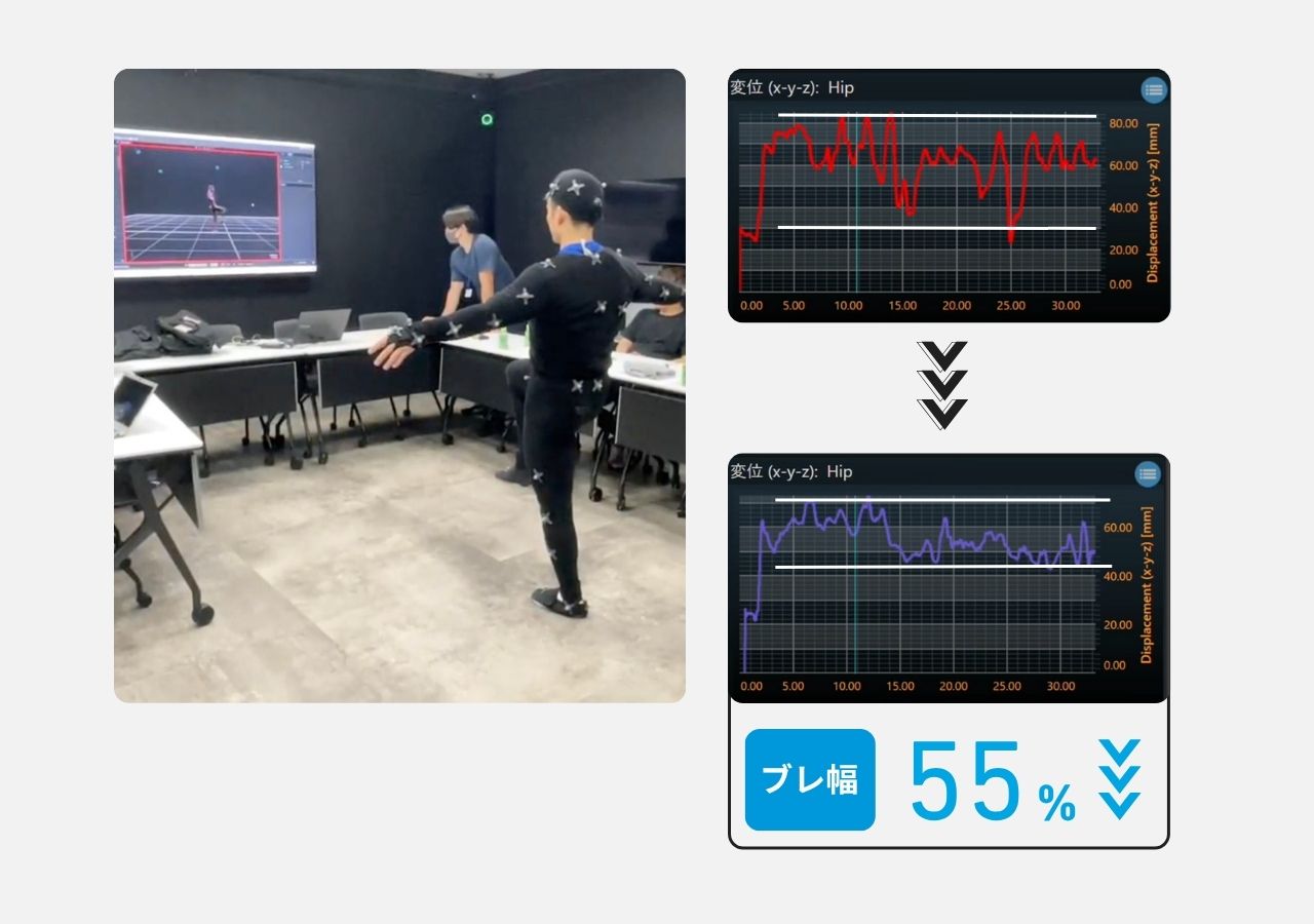 FT™︎アイテムを身につけた時に通常時と比べ、ブレ幅が55%軽減しました。