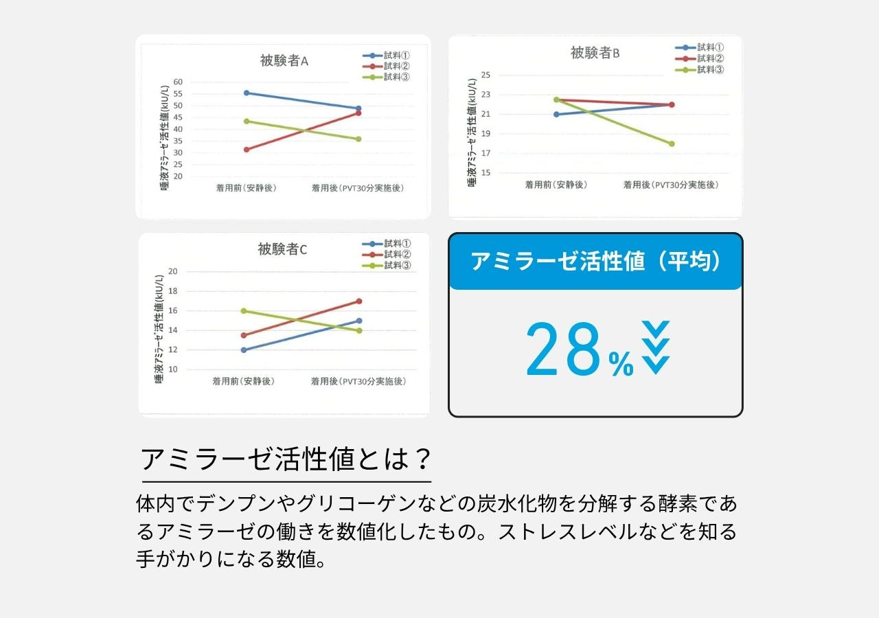 FT™︎技術を適用したTシャツを着用して試験を実施したところ、作業後のアミラーゼ活性値が約28%軽減した。